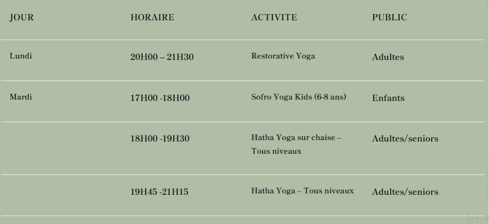 Les activités sont ouvertes à toute personne souhaitant retrouver un rythme intérieur, cultiver la détente, la souplesse, l’équilibre et le lien aux autres.